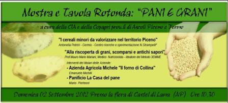 La Cia Confederazione Italiana Agricoltori e la Copagri delle province di Ascoli e Fermo, nell'ambito della Fiera del Santissimo Crocifisso di Castel di Lama, organizza una tavola rotonda sul tema: “Pani e grani”. La tavola rotonda, in programma domenica 2 settembre 2012 con inizio alle ore 10,30, si aprirà con l'intervento di Antonella Petrini del Cermis – Centro ricerche e sperimentazione per il miglioramento vegetale "N.Strampelli" sul tema: "I cereali minori da valorizzare nel territorio Piceno" e seguirà la relazione del Prof. Mauro Mario Mariani, Medico Chirurgo Nutrizionista- Ideatore del Metodo 3 emme Mantenimento Massa Magra sul tema: "Alla riscoperta di grani, scomparsi e antichi sapori". Inoltre interverranno anche panificatori quali: Azienda Agricola Michele "Il forno di Collina", Emanuele Michilli e Mario Pierleoni del Panificio La Casa del pane. “La corretta educazione alimentare è fortemente caratterizzata – hanno detto i responsabili della Cia Confederazione Italiana Agricoltori e della Copagri delle province di Ascoli e Fermo – dalla qualità dei prodotti alimentari. Spesso la qualità si coniuga perfettamente con la riscoperta di specie e varietà autoctone, come in questo caso, che sono fondamentale per l'adozione di una corretta alimentazione”.Dopo la tavola rotonda si svolgerà l'ormai tradizionale premiazione delle aziende agricole guidate dai giovani. Infatti anche nelle province di Ascoli e di Fermo si sta registrando un sempre maggiore interesse, tra i giovani, a creare una nuova aziende nel settore primario.
