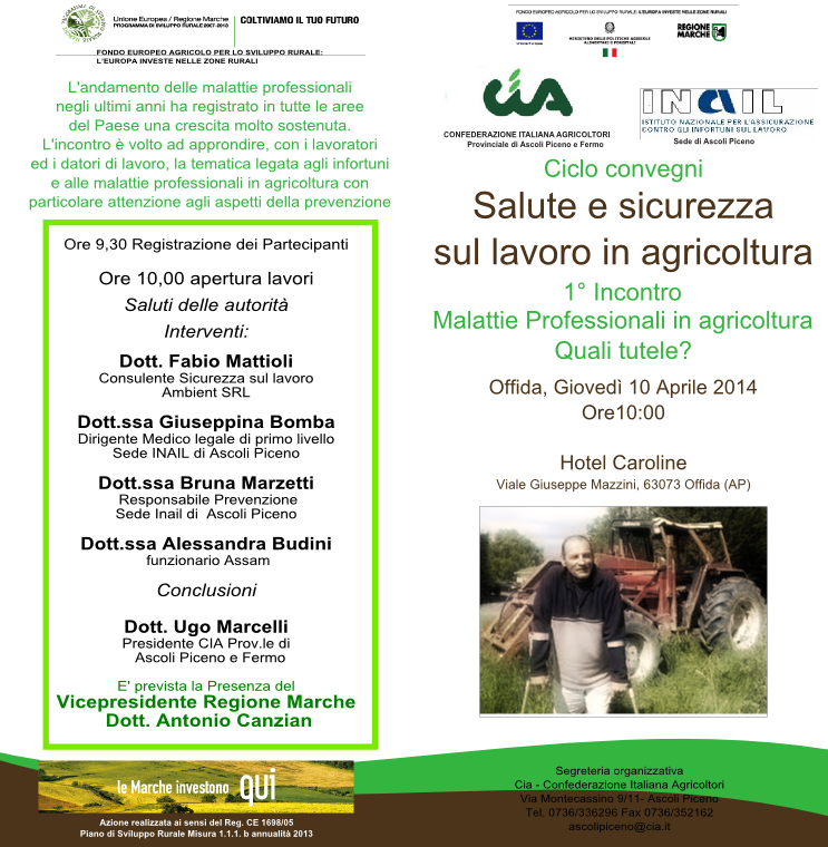 Mario Massa è stato confermato all'unanimità presidente Anp – Associazione nazionale pensionati della Cia (Confederazione italiana agricoltori) delle province di Ascoli e Fermo mentre Giannino Nazzari segretario. L'elezione, che si è svolta nei giorni scorsi presso l'hotel Caroline di Offida, è stata anticipata dal primo appuntamento, relativo al ciclo di convegni su “Salute e sicurezza sul lavoro in agricoltura”, relativo a “Malattie professionali in agricoltura. Quali tutele?”. L'incontro è stato occasione per approfondire, con i lavoratori e datori di lavoro, la tematica legata agli infortuni e alle malattie professionali in agricoltura con particolare attenzione agli aspetti della prevenzione. Al simposio, organizzato dalla Cia di Ascoli e Fermo e dall'Inail sede di Ascoli, hanno preso parte tra gli altri: Ugo Marcelli presidente Cia provinciale, Fabio Mattioli consulente sicurezza sul lavoro Ambient Srl, Giuseppina Bomba dirigente medico legale Inail Ascoli, Bruna Marzetti responsabile prevenzione Inail Ascoli e Alessandra Budini funzionario Assam. L’Assemblea elettiva della ANP Marche, in relazione alle problematiche previdenziali e socio-sanitarie ha illustrato alcune proposte che interessano sia i pensionati sia gli imprenditori agricoli. Tra le proposte relative al settore socio-sanitari vi sono: - la sanità deve rimanere un servizio pubblico; forte impegno sia per eliminare o contenere in tempi minimi le liste di attesa sia per eliminare o ridurre il costo dei ticket, con l’introduzione sia dell’ISEE sia delle fasce di reddito; garantire ed assicurare nelle aree rurali servizi sufficienti ed efficienti per far fronte alle necessità di primo intervento nei presidi esistenti; sostenere con contributi adeguati le famiglie che accudiscono in casa gli anziani non autosufficienti incrementando il fondo per l’assegno di cura e per l’A.D.I. (Assistenza Domiciliare Integrata). Per quanto concerne le proposte per il settore previdenziale l'Assemblea elettiva ha evidenziato: - eliminare ogni discriminazione basata sull’appartenenza a categorie lavorative (lavoro dipendente e lavoro autonomo) durante la vita attiva; garantire un livello pensionistico accettabile; intervenire con decurtazioni sulle max pensioni per creare un fondo ad integrazione delle pensioni minime; rivedere, e, quindi, diminuire il carico fiscale dei pensionati tra i più alti in Europa; rivedere l’attuale sistema di calcolo delle pensioni (contributivo) il quale porterà ad incrementare a dismisura la fascia di povertà dei futuri pensionati per cui è necessario aumentare le attuali aliquote di rendimento.
